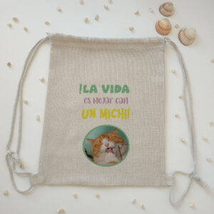 Mochila tipo lino «La vida es mejor con un michi personalizada»