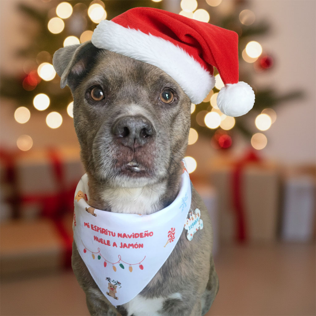 La bandana está estampada con alegres motivos navideños que capturan toda la magia de la temporada. La protagonista indiscutible es la graciosa inscripción: «Mi espíritu navideño huele a jamón», una declaración de principios que hará reír a toda la familia.