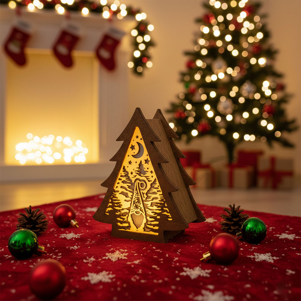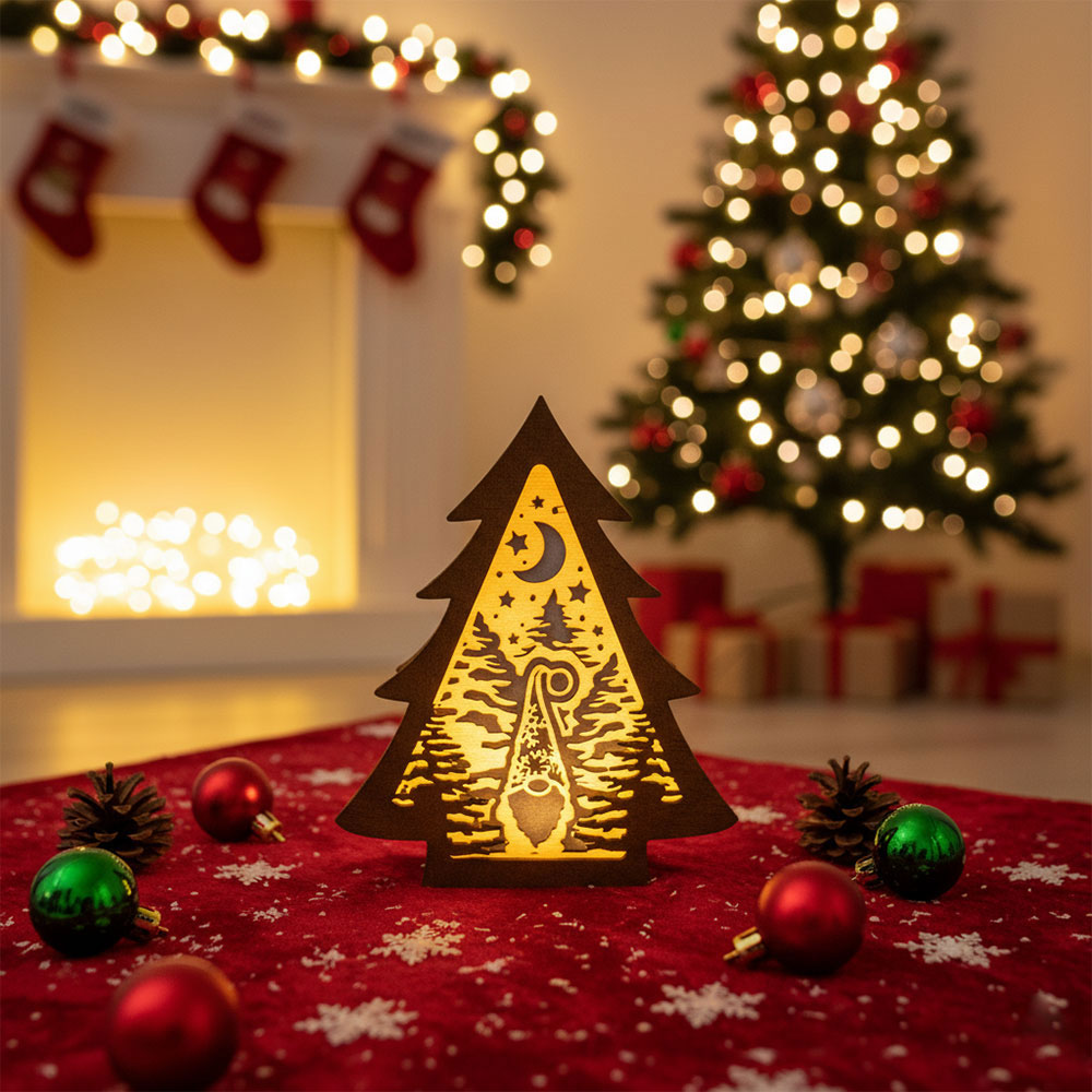 Ilumina la magia de la Navidad con esta preciosa lámpara decorativa de madera, con forma de abeto y un encantador diseño navideño cortado con detalle. Fabricada en contrachapado de 3 mm, combina elegancia y calidez, creando un ambiente acogedor en cualquier rincón de tu hogar.