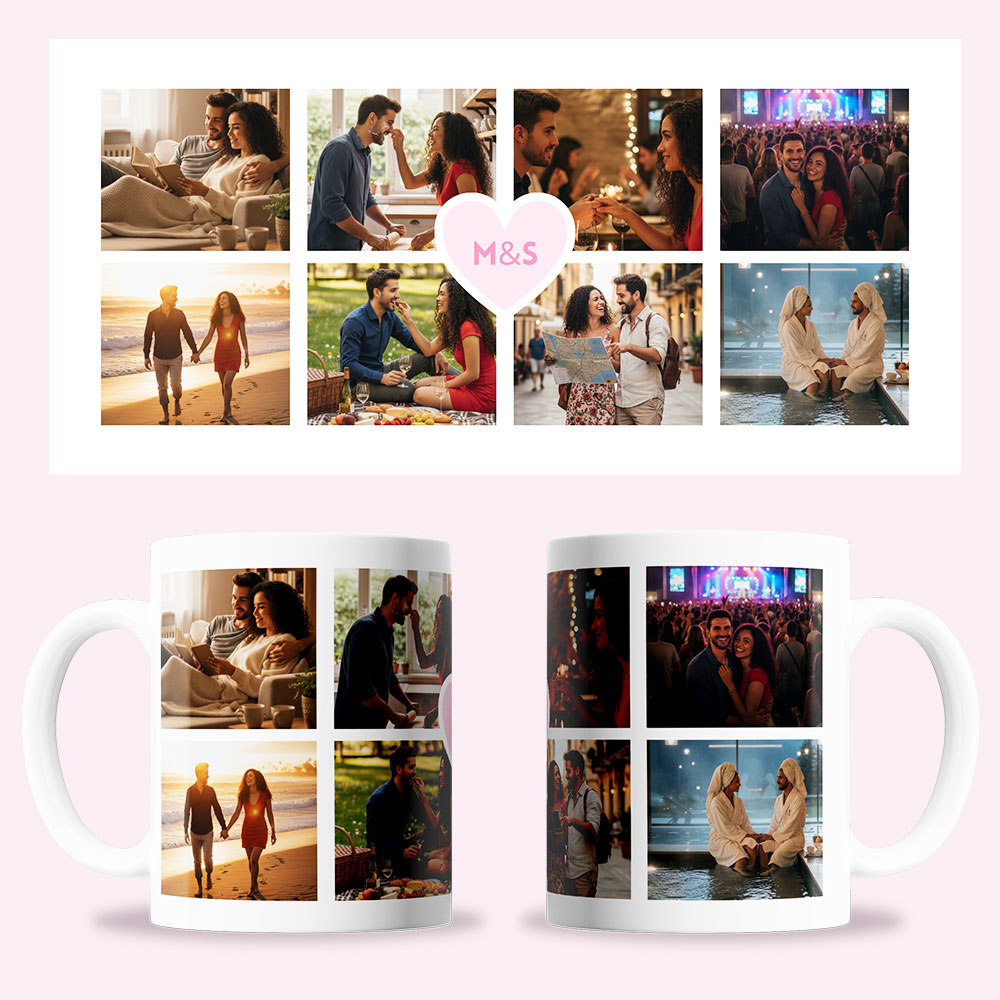 Empieza cada mañana recordando vuestros mejores momentos con esta taza de San Valentín personalizada, diseñada para celebrar vuestra historia de amor. Incluye 8 fotos especiales de la pareja y las iniciales personalizadas, creando un recuerdo único que acompaña cada café o desayuno.