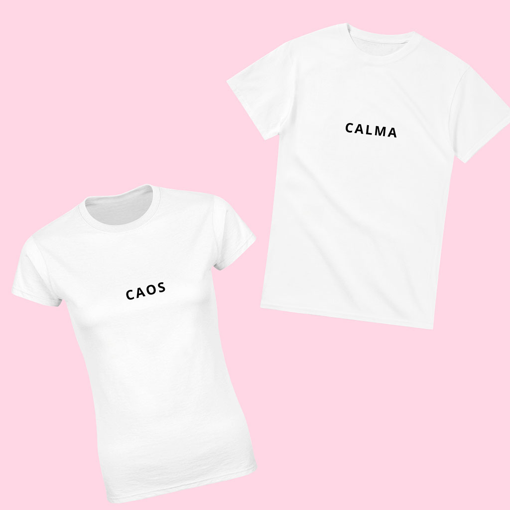 Una camiseta lleva la palabra “Calma” y la otra “Caos”, creando un dúo original, cómplice y con mucho sentido del humor. Ideales para llevar juntos y sacar sonrisas allá donde vayáis.