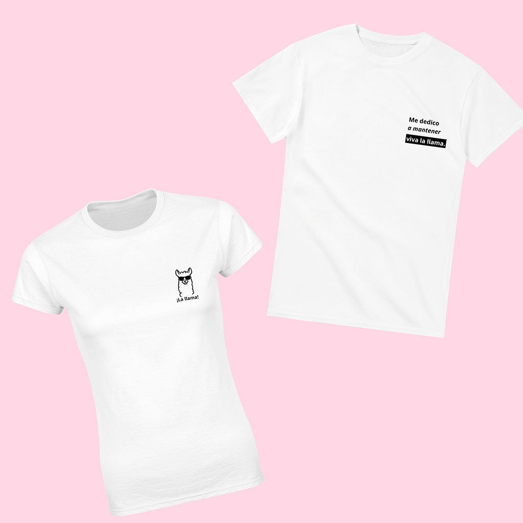 Una camiseta lleva la frase “Me dedico a mantener viva la llama” y la otra “La llama”, acompañada de un dibujo de una llama, creando un conjunto perfecto para parejas con mucha complicidad. Personalizables para cualquier tipo de pareja, son ideales para llevar juntas y sacar sonrisas allá donde vayáis.