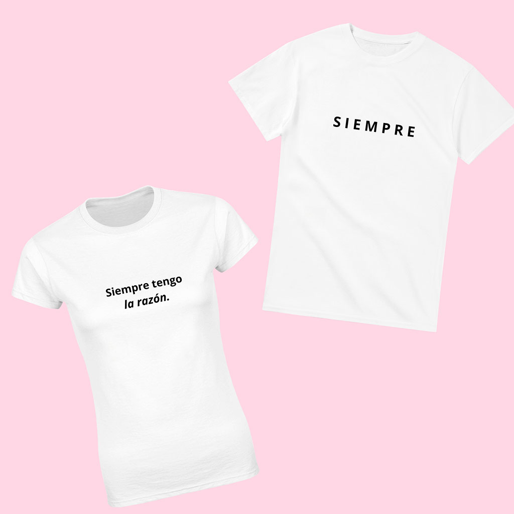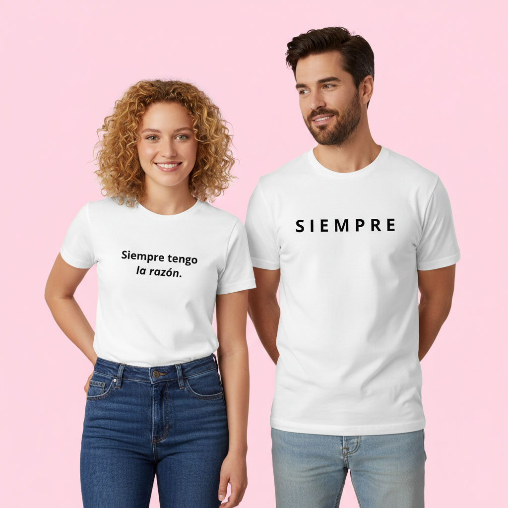 Una camiseta lleva la frase “Siempre tengo la razón” y la otra simplemente “Siempre”, formando un dúo ingenioso y lleno de ironía que arranca sonrisas al instante. Personalizables para cualquier tipo de pareja, son ideales para llevar juntas y demostrar quién manda… o no 😉.
