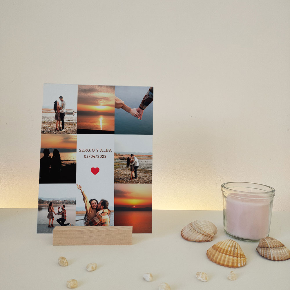 Reúne tus momentos más especiales en una lámina única. Esta pieza personalizada permite incluir hasta 8 fotos, con vuestros nombres y la fecha especial en el centro, creando un recuerdo que captura vuestra historia de manera elegante y emotiva, con diseño vertical.