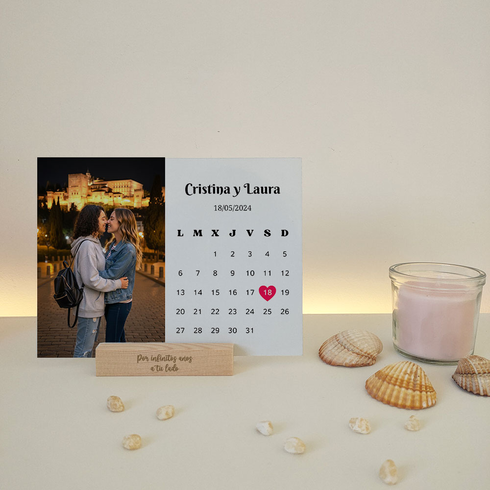 Convierte una fecha importante en un recuerdo para siempre con esta lámina de aluminio personalizada, diseñada para destacar los momentos que marcan vuestra historia. Incluye una foto especial, los nombres personalizados y un calendario, donde la fecha elegida aparece marcada para que nunca se olvide.